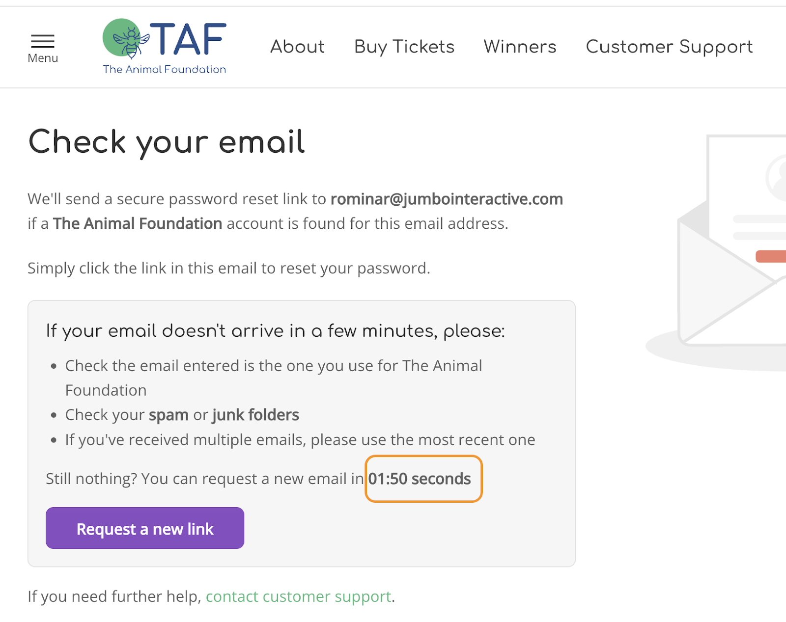 - Instead, the supporter will be redirected to the confirmation page with the previous reset email details and a countdown timer next to the ‘Request a new link’ button.