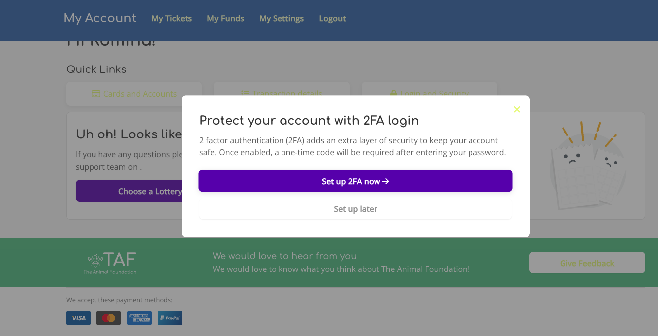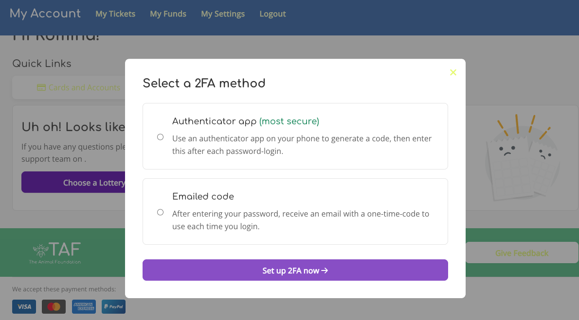 Once this feature is enabled on your lottery site, supporters will be prompted during their first regular login (excluding checkout logins) to secure their account with 2FA. This one-time prompt encourages them to take action without adding unnecessary friction to the purchase process.