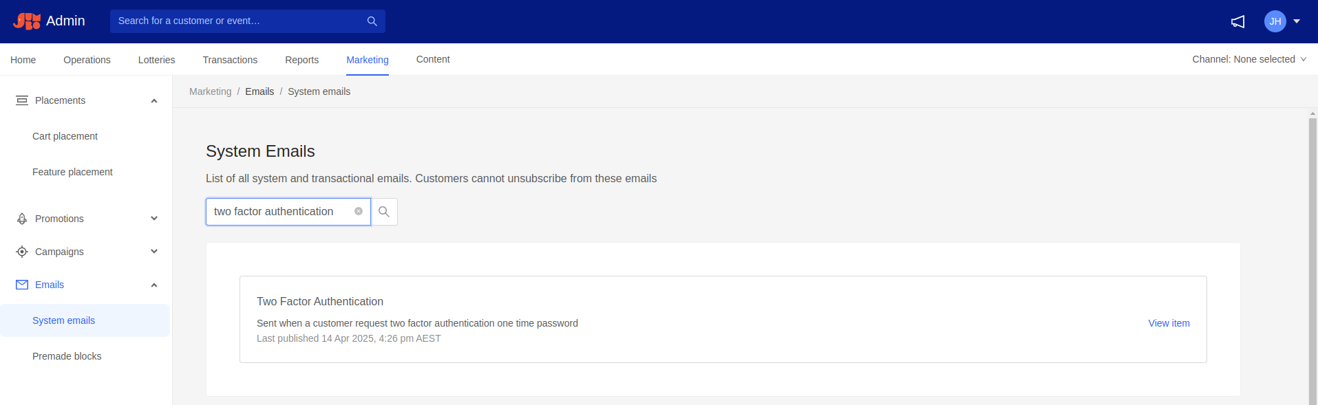 Marketing → Emails → System emailsSearch for Two Factor Authentication