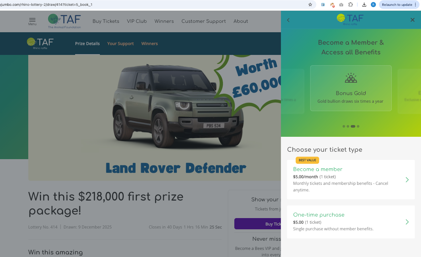 The updated page puts VIP/Autoplay benefits front and centre and improves how ticket bundles and options are presented. Ticket options are now displayed in a modal on the prize details page, with ticket bundles presented to supporters first. After selecting a ticket bundle, supporters will then be presented with ticket types, one-time or recurring purchase. The carousel at the top of the modal displays VIP program benefits, with additional copy driving recurring purchase conversion. Upon choosing the ticket type, the product is added to the cart.