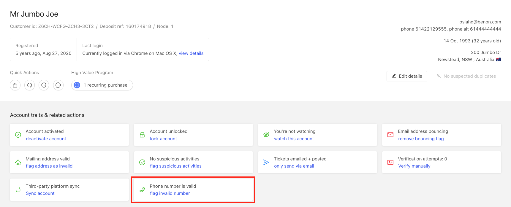 An Invalid phone number flag is now displayed on the customer Admin profile.