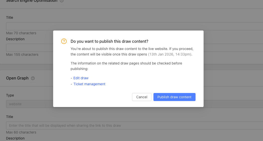 - A new window will open showing how the draw will appear on the website. If you are happy with the draw preview move to the next step and publish the changes.