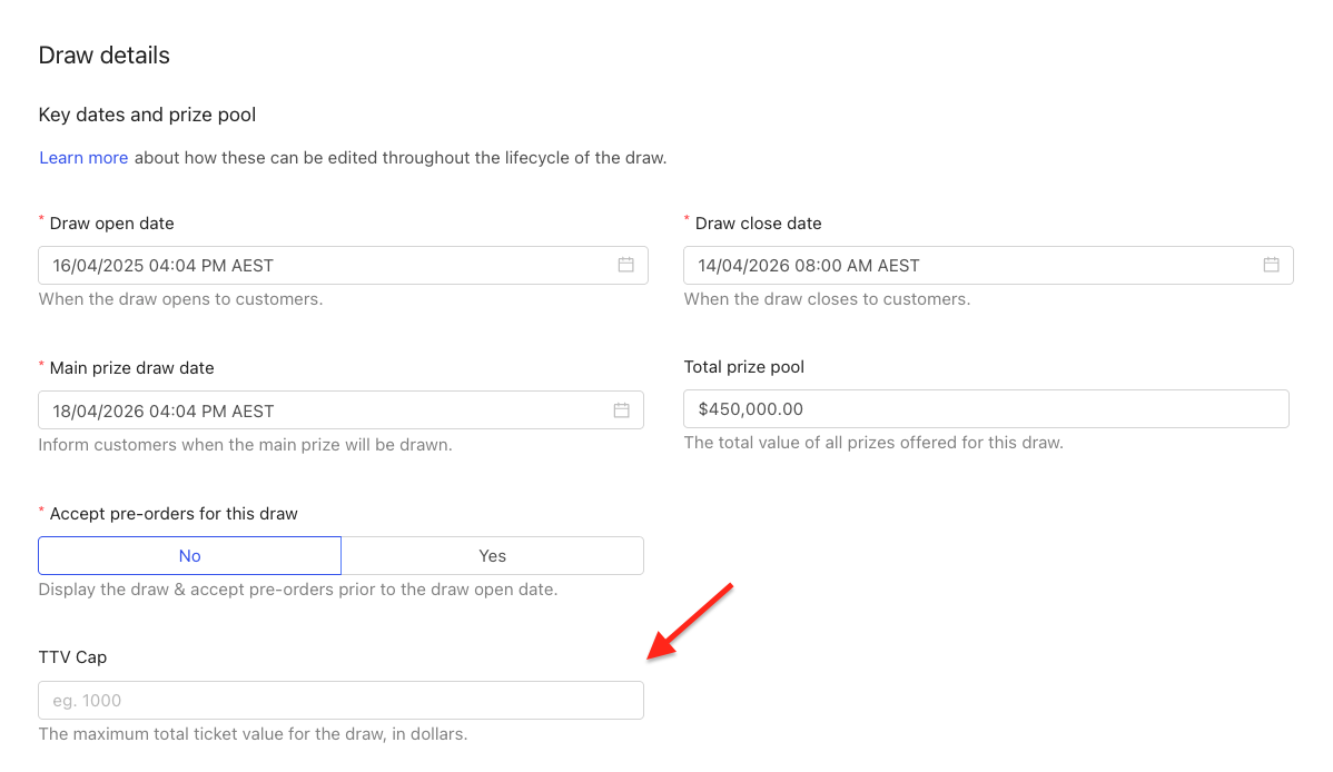 You can now configure a maximum draw TTV cap in JLP Admin. When ticket sales reach this threshold, or a single sale of the minimum ticket book value will result in TTV going over the cap, the draw will automatically close. The feature also supports API sales channels, ensuring the same compliance protections apply regardless of where tickets are purchased.